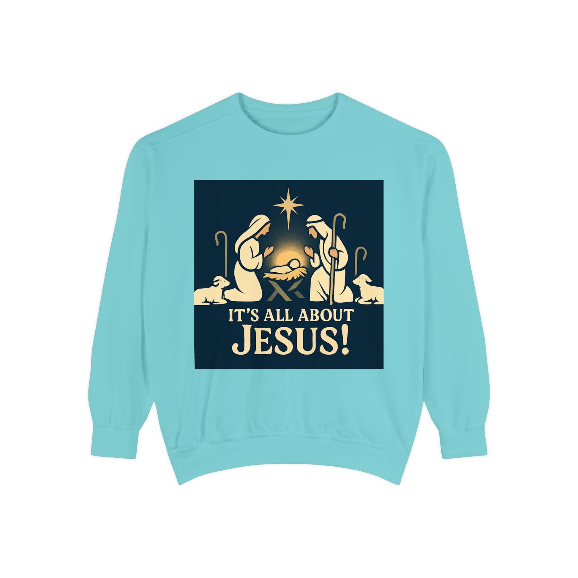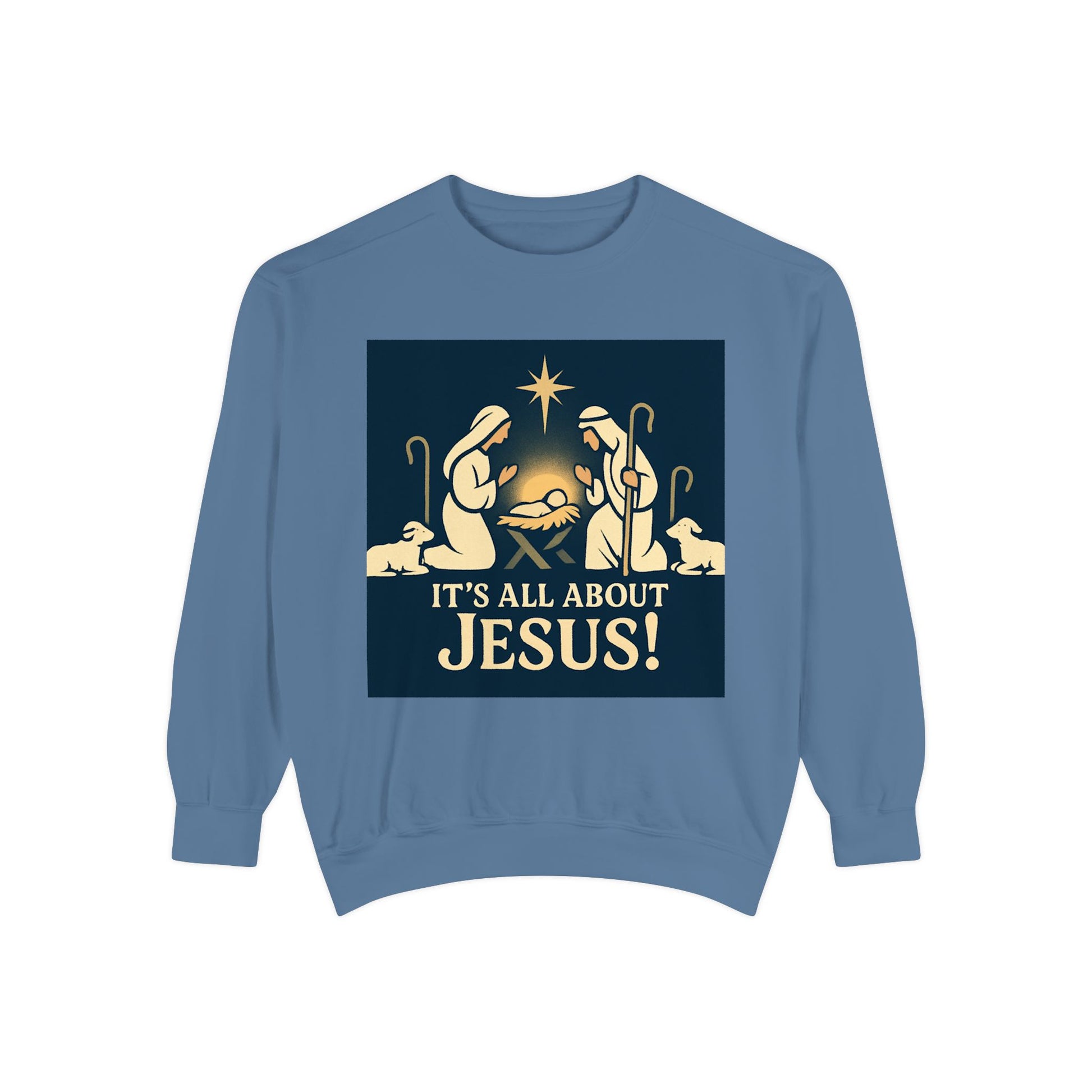 Introducing our cozy Unisex Garment-Dyed Sweatshirt, designed to uplift your spirit and celebrate your faith. Featuring a delightful 'It's All About Jesus!' graphic, this sweatshirt is perfect for spreading joy during the holiday season. Made from soft, luxurious fabric, it offers a relaxed fit that ensures comfort whether you’re at a festive gathering or relaxing at home. Ideal for adults who cherish stylish, meaningful attire, this sweatshirt makes a thoughtful gift for Christmas, Easter, and church events. Embrace a warm, inviting atmosphere with this charming addition to your wardrobe, suitable for casual outings, family gatherings, or cozy nights in.