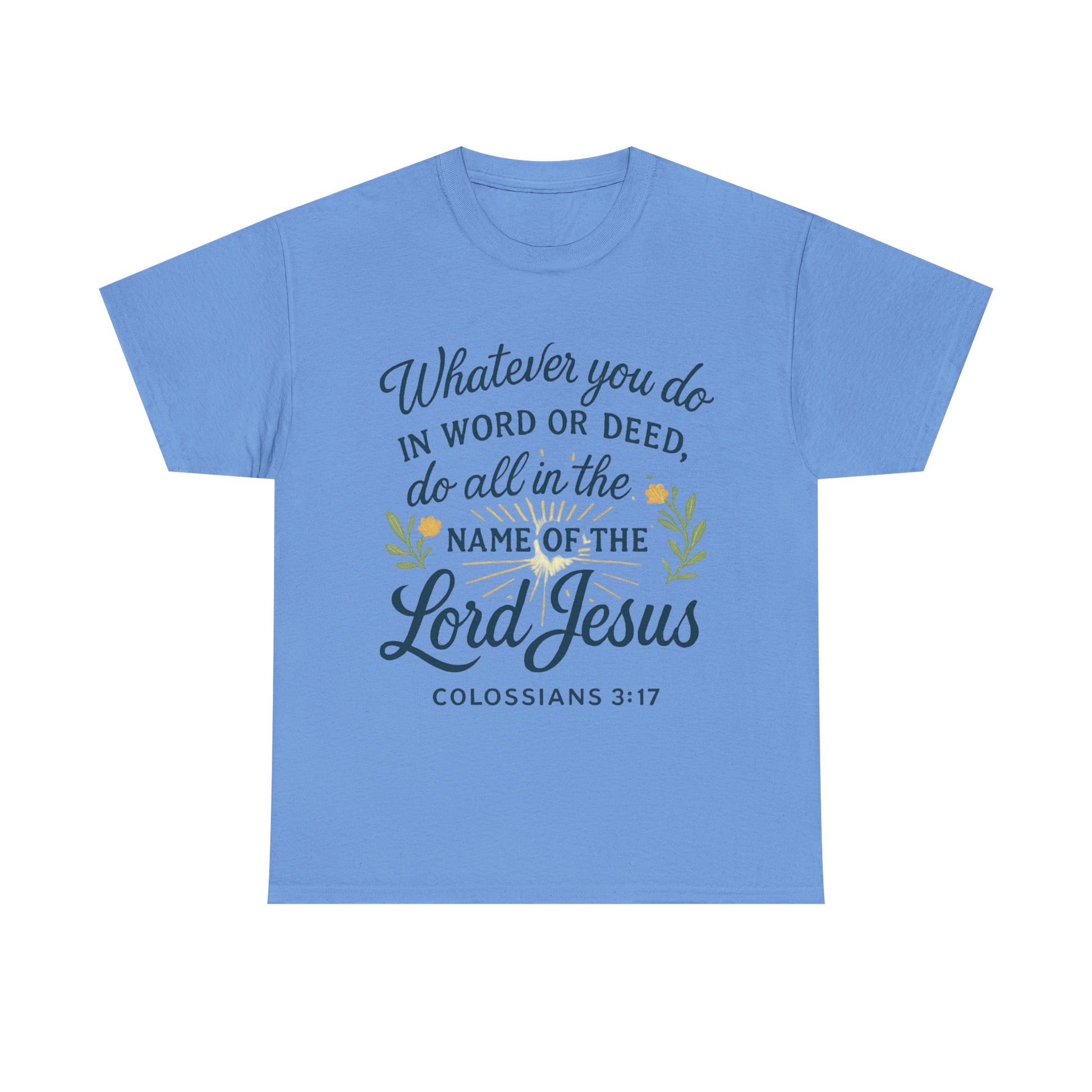 An inspirational t-shirt featuring the phrase 'Whatever you do in word or deed, do all things in the name of the Lord Jesus' Colossians 3:17. This tee exudes positivity and faith, making it perfect for religious individuals looking for a wearable reminder of their beliefs. Suitable for everyday wear, this t-shirt can be worn to church services, religious gatherings, or simply as a way to express one's spirituality.