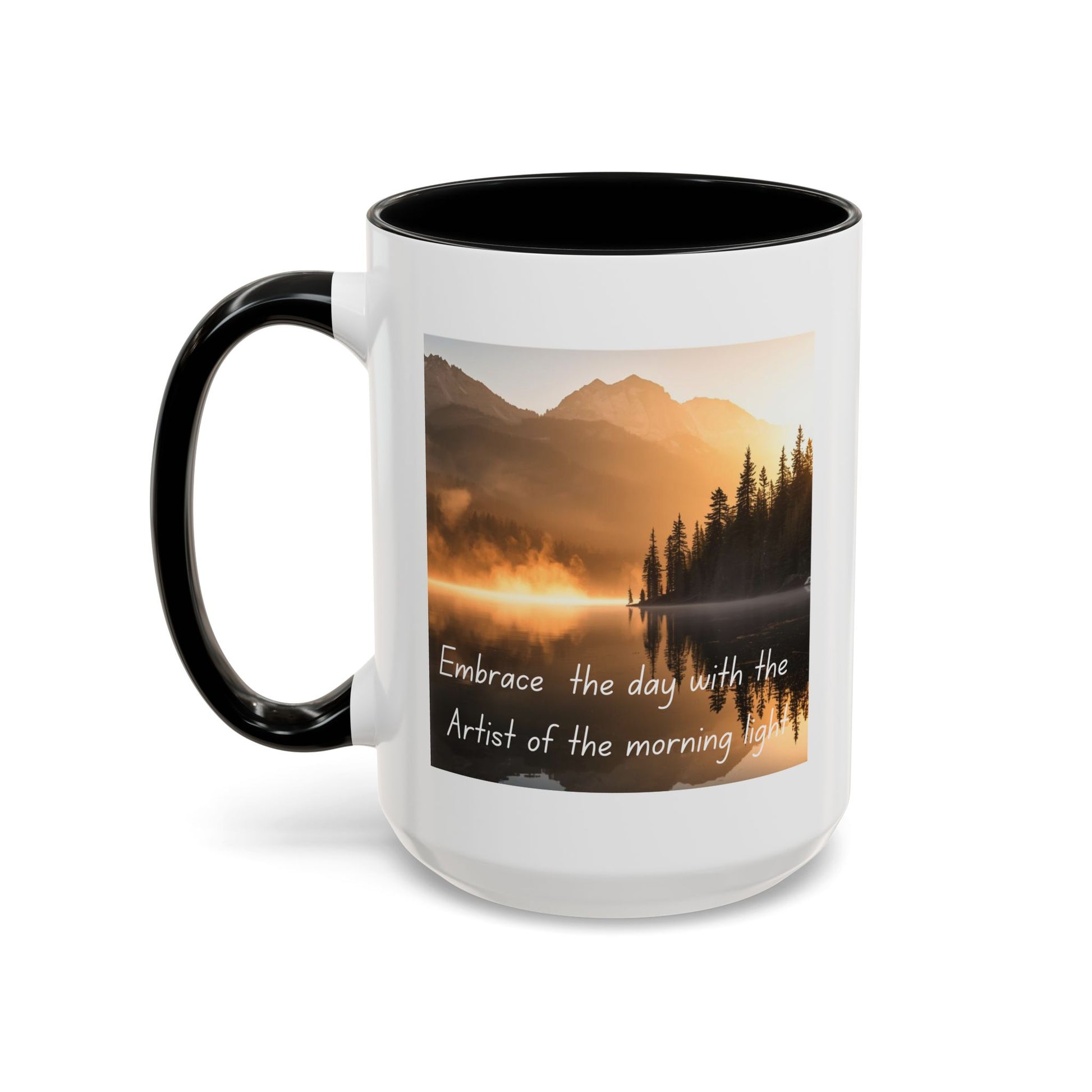 Start your mornings right with this stylish Coffee Mug featuring the inspiring quote 'embrace the day with the Artist of the morning light'. Perfect for coffee lovers who appreciate a good aesthetic touch to their morning routine. Ideal for birthdays, holidays, and every day use.
