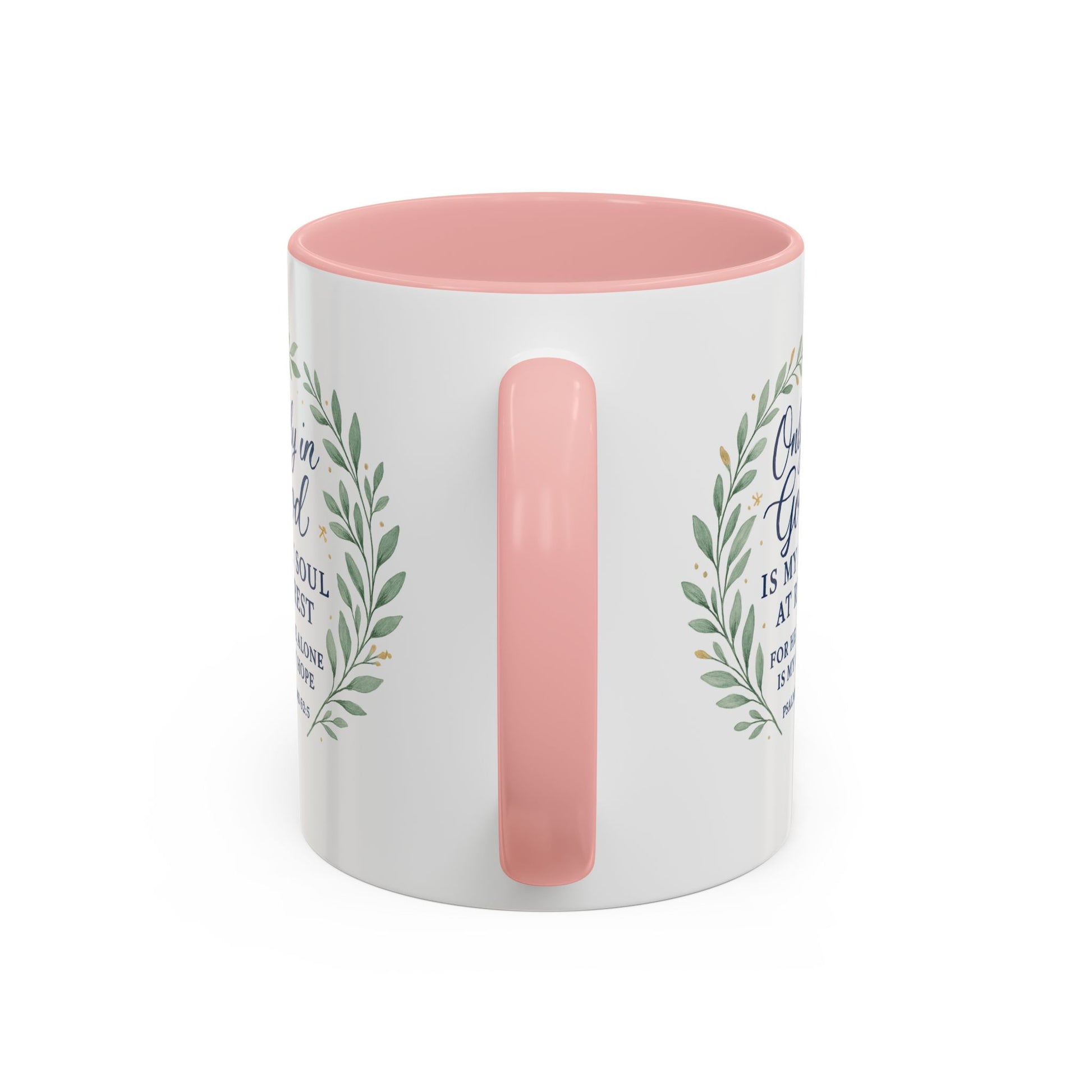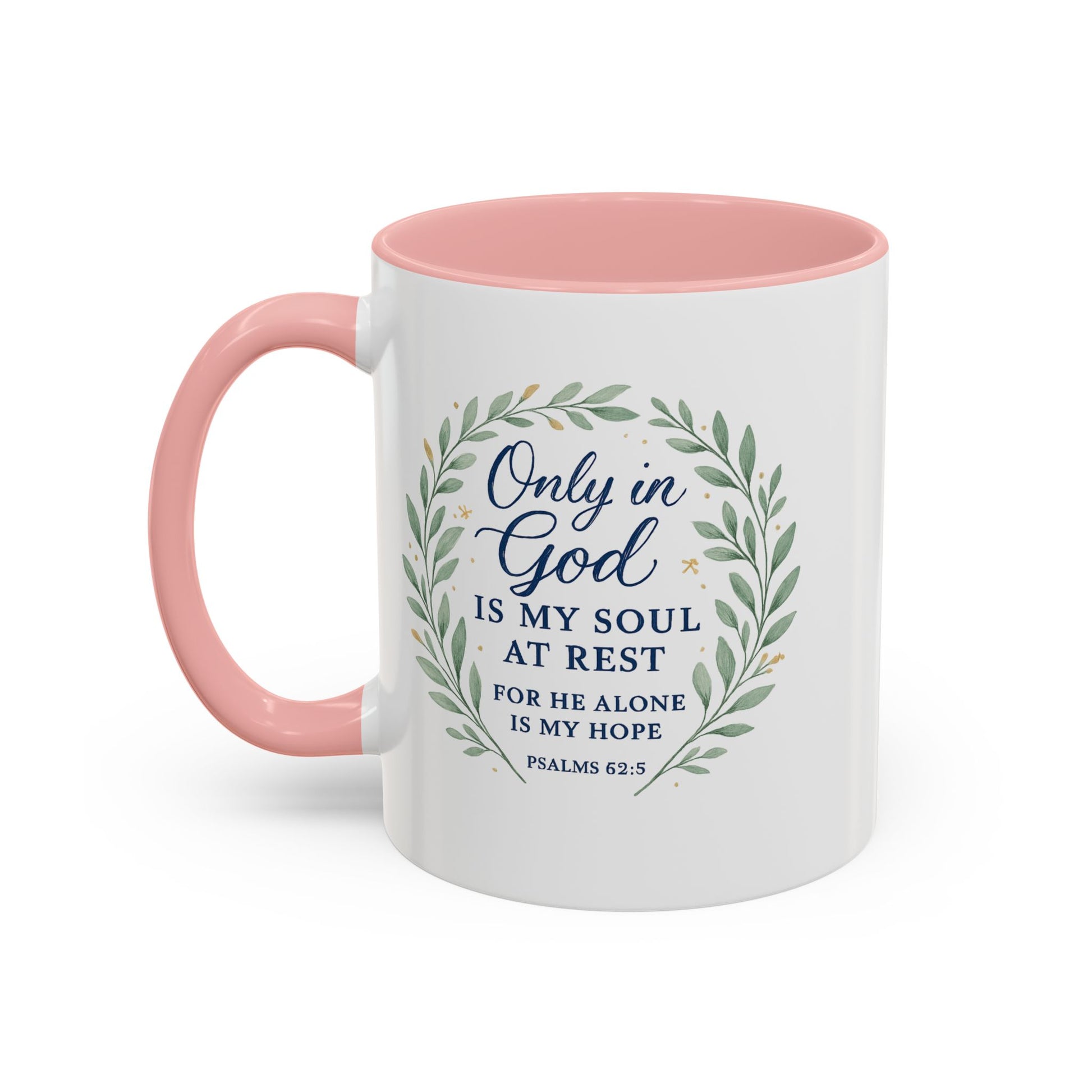 A beautiful coffee mug with the inspiring quote "Only in God is My Soul at Rest for He alone is my hope". This mug gives a sense of peace and hope, suitable for those looking for spiritual comfort in their daily routine. Perfect for religious individuals or as a thoughtful gift for religious holidays and occasions. Great for coffee, tea or any beverage.