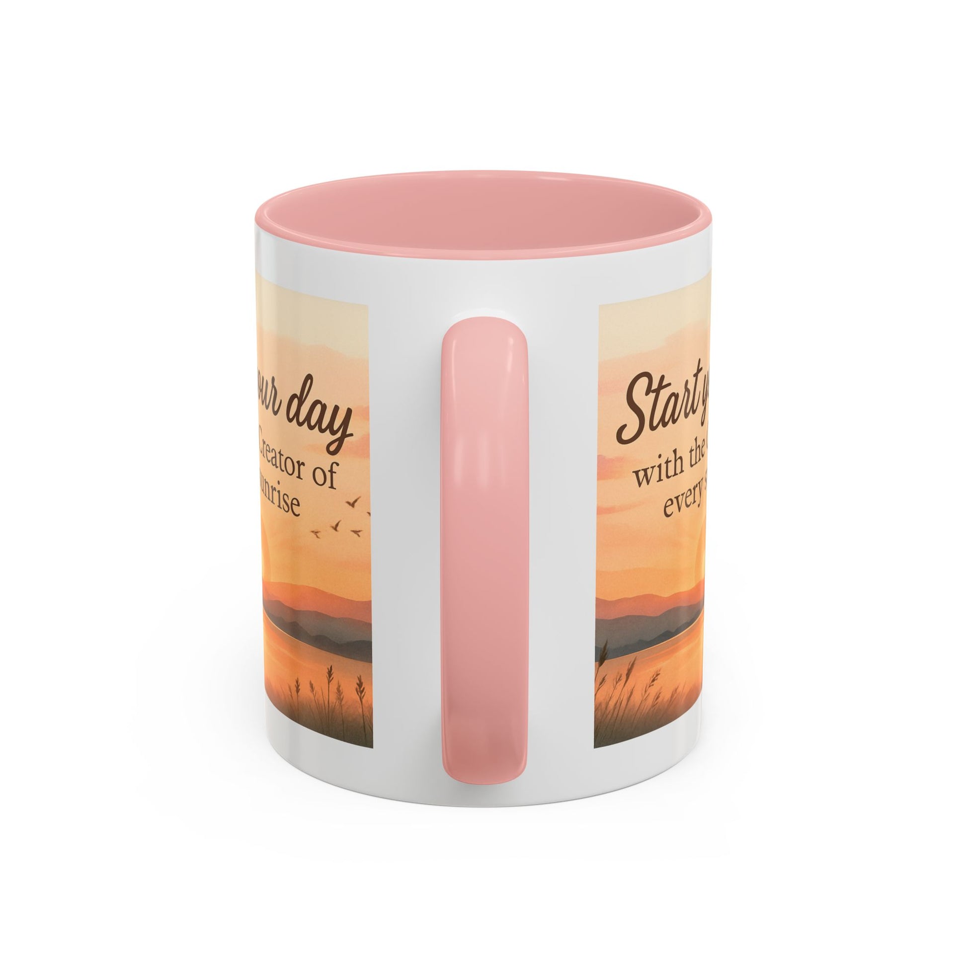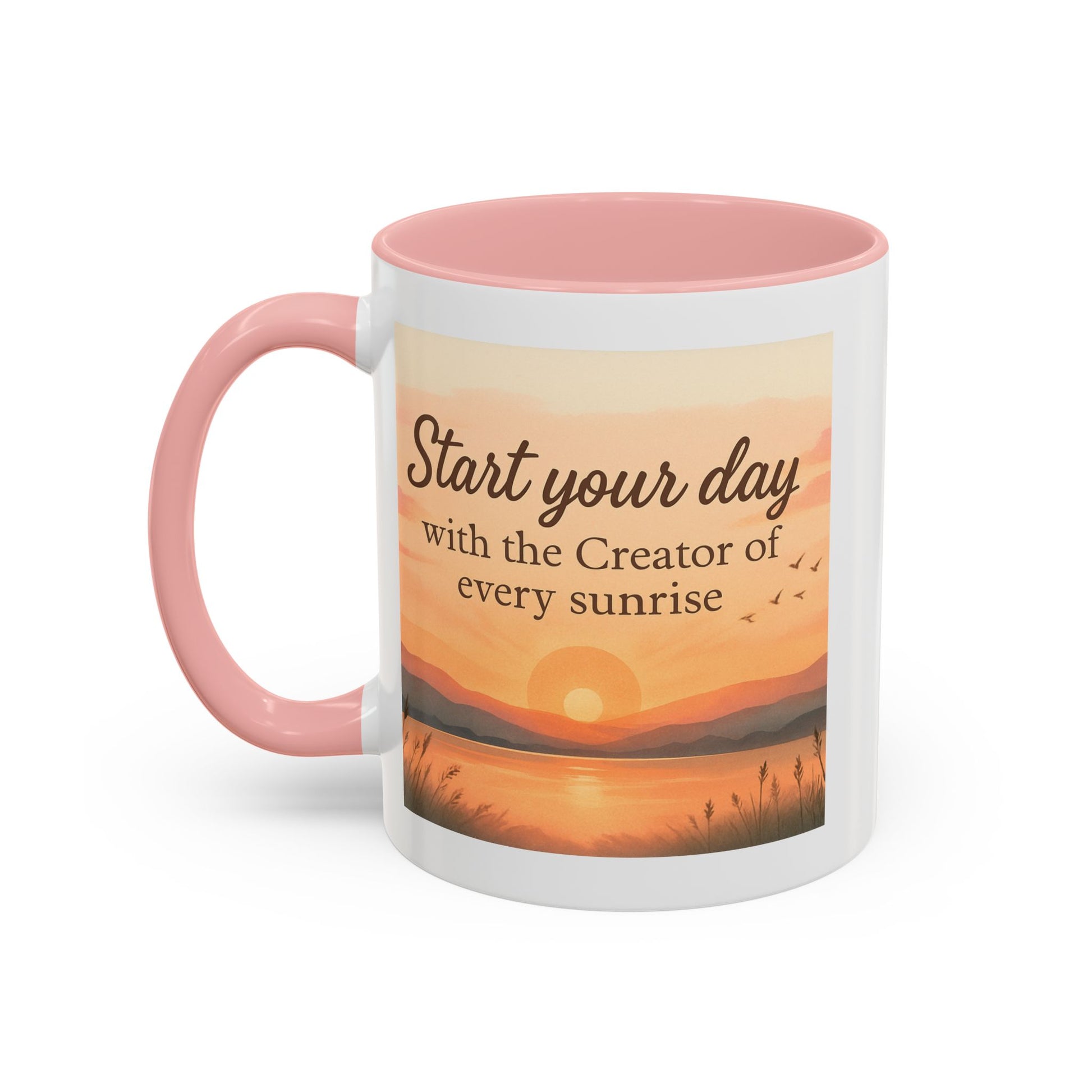 A vibrant coffee mug featuring the phrase 'Start Your Day with the Creator of Every Sunrise'. Perfect for those who appreciate a positive and motivating start to their day. Ideal for coffee lovers and those who enjoy inspirational quotes. Relevant for morning routines, birthdays, holidays, and everyday use.